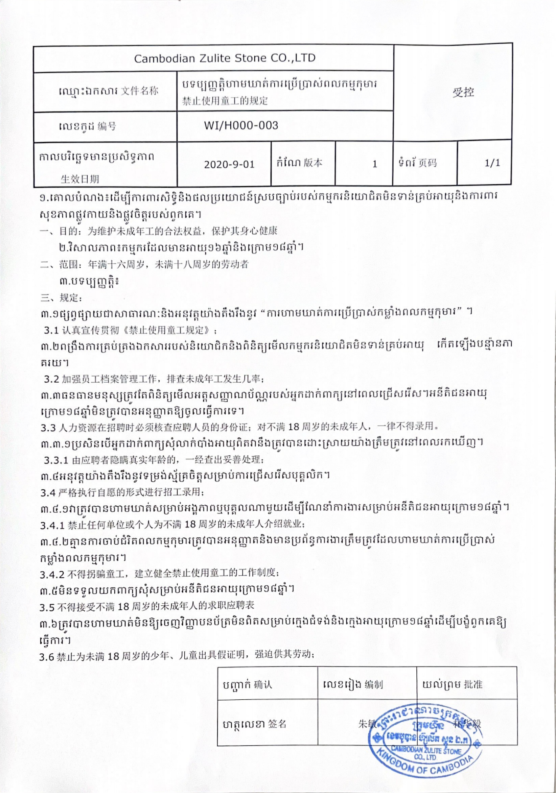 Download the file to gain insights into Cambodian Zulite Stone Co., Ltd.'s adherence to local regulations, prohibiting the use of child labor. Established in 2019, Cambodian Zulite Stone Co., Ltd. is a professional quartz factory that has consistently upheld this policy since its inception. This initiative aims to safeguard the legal rights and well-being of underage workers, specifically those aged 16 to 18, ensuring their physical and mental health.